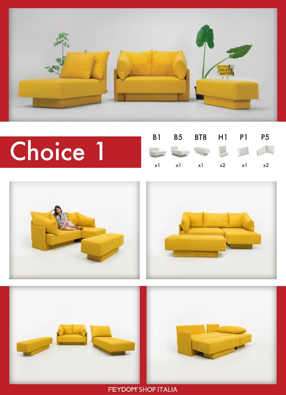 Choice 1 è la nostra proposta per un set di base, asseblato con alcuni elementi nell’assortimento di Choice. Un doppio sedile (B1), un sedile lungo (B5), uno sgabello (BT8), due braccioli (H1), un cuscino (P1) e due cuscini angolari (P5). Si può trasformare da un divano angolare a uno set di tre elementi separati o un letto per due persone. Sotto ogni elemento si trova un ripostiglio e le coperte de ogni sedile e cuscino sono rimovibili e lavabili in lavatrice.