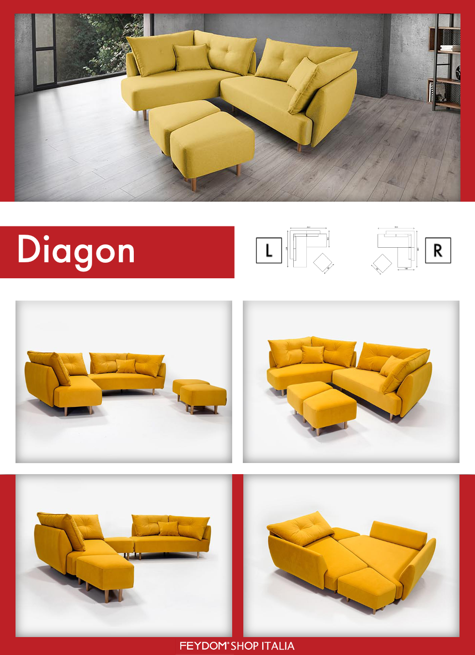 DIAGON è composto da 2 Lounge e 2 Stool. Può essere facilmente spostato in diverse posizioni, compreso il letto. DIAGON – Nuovo sistema di divani componibili che può essere ridisegnato.L’aspetto minimalista è ottenuto con diagonali, che conferiscono un aspetto elegante e lussuoso. Si adatta perfettamente a uffici, hotel e soggiorni.